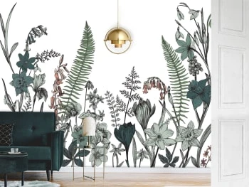 Couleurs : camaïeu de verts et bleu paon, de rose nude et terracotta.